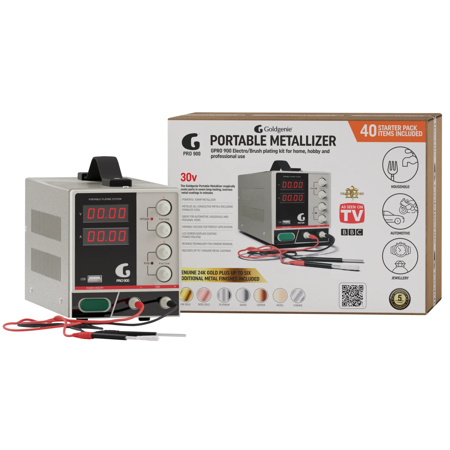 The GPRO 900 is an innovative portable gold plating system that allows its user to metalize hundreds of everyday items in a range of precious and semi-precious metals including 24k Gold and Platinum. Simple to use and understand the GPRO 900 portable metallizer comes complete with a Quickstart guide and step-by-step video tutorial that will have you plating your first item in under 6 mins.