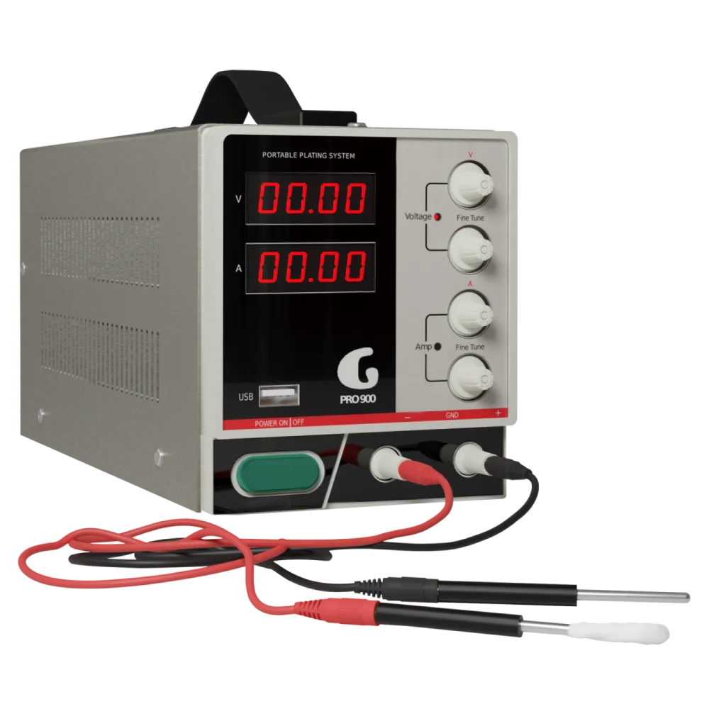 The GPRO 900 portable gold plating system lets you metalize items in 24k Gold, Platinum, and other precious metals. It’s user-friendly, includes enough chemicals to recoup your investment, and comes with a QuickStart guide and video tutorial to get you plating in under 6 minutes.